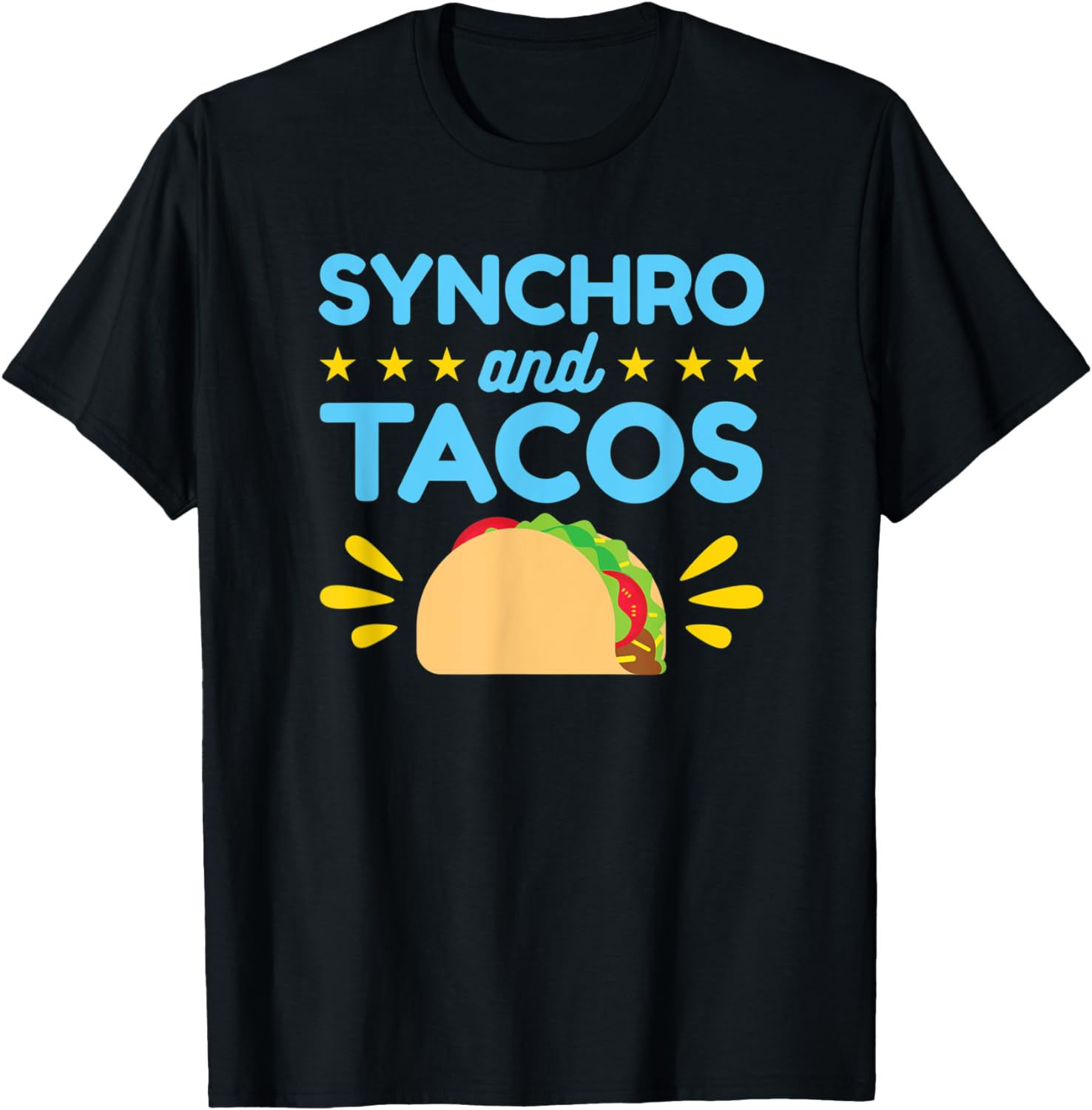 Synchronized Swimming Tee Shirt - Synchro And Tacos. If you love going out for tacos after synchronized swimming practice, this cool tee shirt is perfect. This swimming and tacos tshirt would make a great birthday present or holiday gift for synchronized swimmers who love tacos.